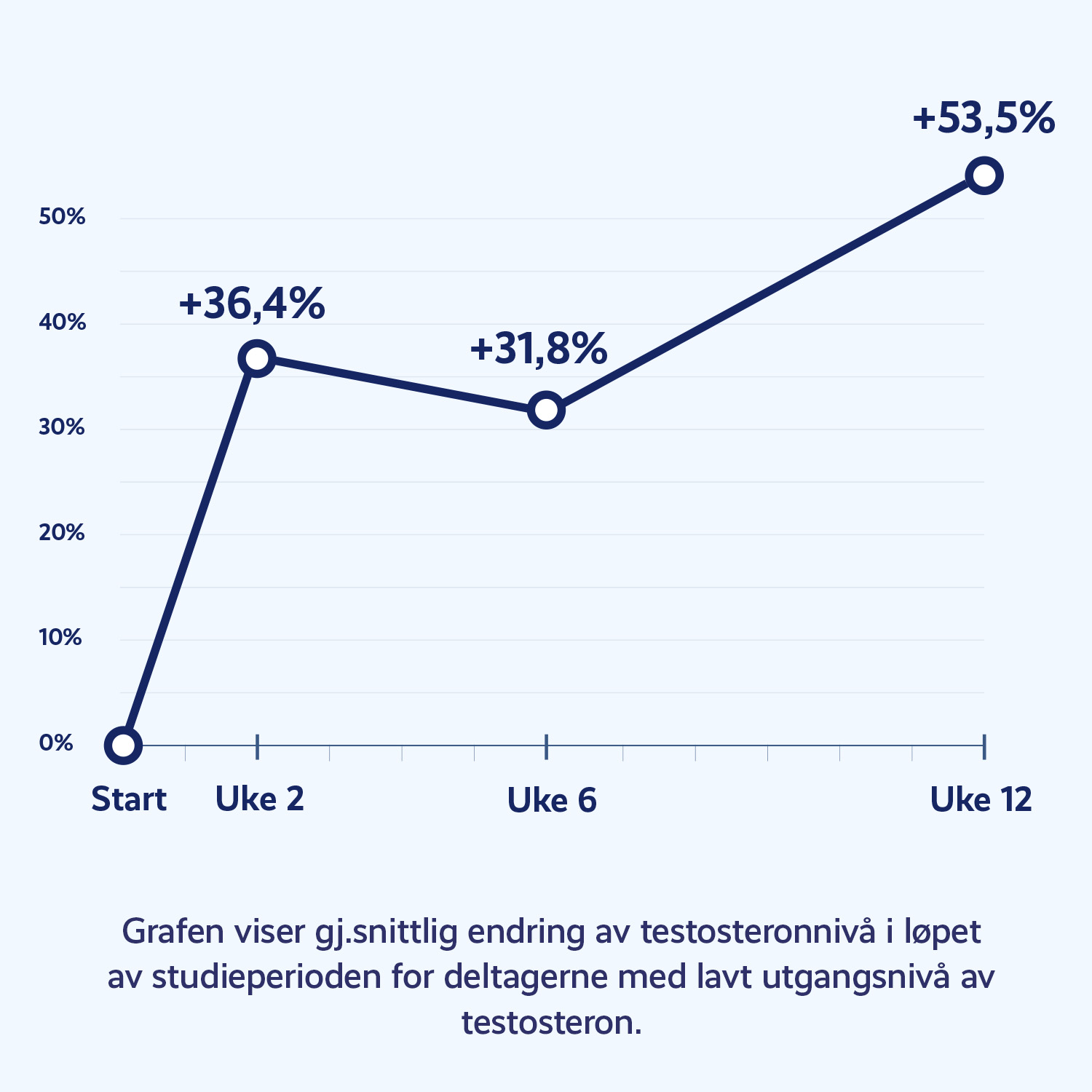 T+ 1800 mg er det eneste tilskuddet som har en publisert, dobbeltblind studie på hele produktet, som viser signifikant økning i testosteronnivå. Studien fra 2024: - Klinisk testet i Forskningsparken i Oslo - Gjennomført på norske menn - Godkjent av Regional Etisk Komité (REK) I studien ble det etter 12 uker observert en gj.snittlig økning på +25% i testosteronnivå (vs. placebo), og +53% hos deltakere med lave startnivåer, samt +36% allerede etter 2 uker i samme gruppe. Effektgaranti: Øk testosteronnivået eller få pengene tilbake